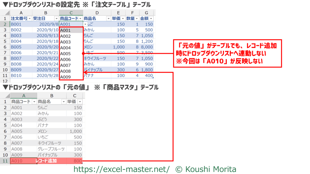 「データの入力規則」の「元の値」で参照するマスタをテーブルにしたとしても、固定のセル範囲扱いとなってしまい、後からマスタへレコード追加してもドロップダウンリスト側へ連動しません。