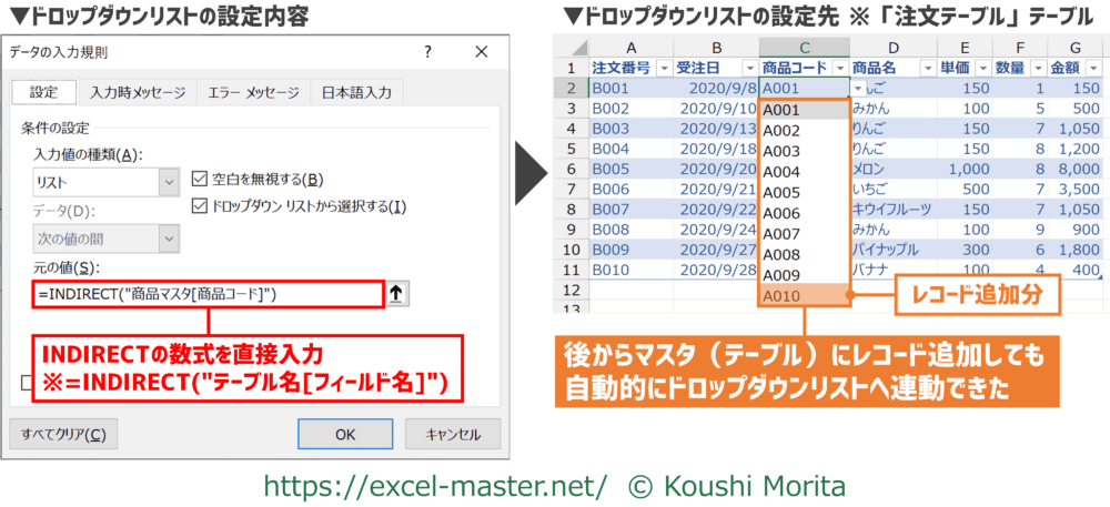 「データの入力規則」+INDIRECT+テーブルの組み合わせテクニックは、ドロップダウンリストとマスタの連動に役立ちます。