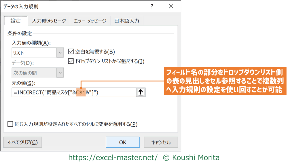 なお、INDIRECTの数式は原則「=INDIRECT(“テーブル名[フィールド名]”)」ですが、参照するマスタが1列のみであれば、「=INDIRECT(“テーブル名“)」と省略してもOKです。