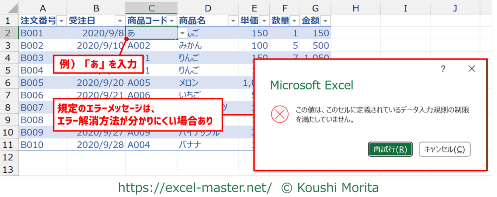 しかし、Excelな不慣れな方が入力者だと、上記の規定のエラーメッセージでは、どう解消すれば良いかが分からないというケースがあります。