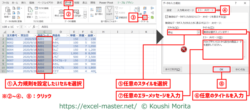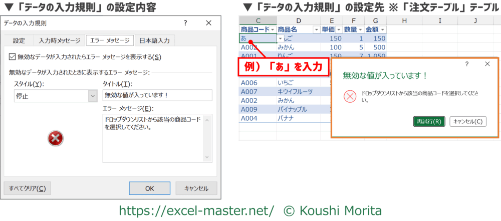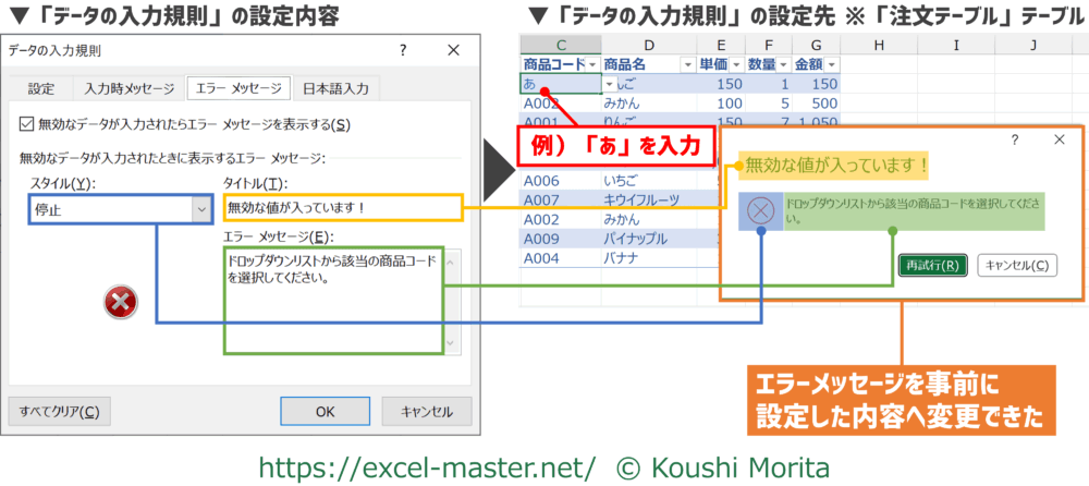 ※今回は「無効な値が入っています!」 - 任意のエラーメッセージを入力