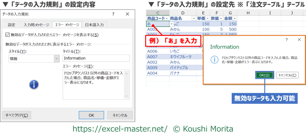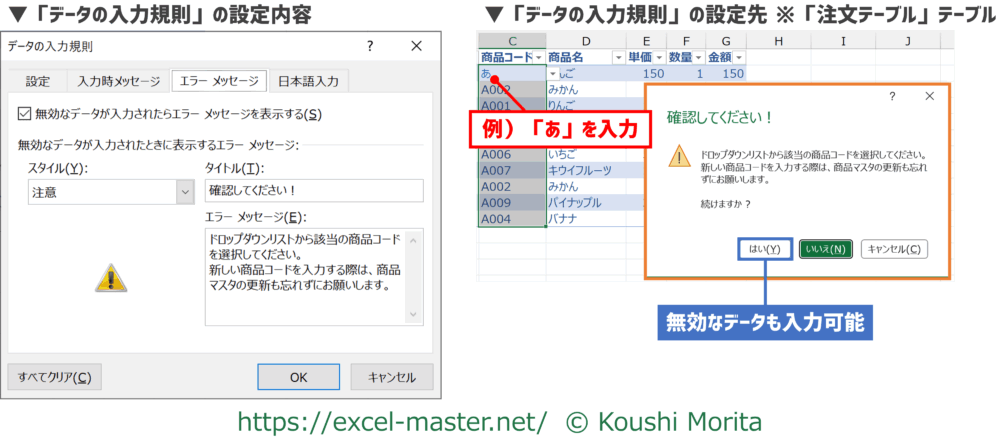 無効なデータを入力した場合、エラーメッセージは表示されますが、「OK」をクリックすれば無効なデータも入力可能です。