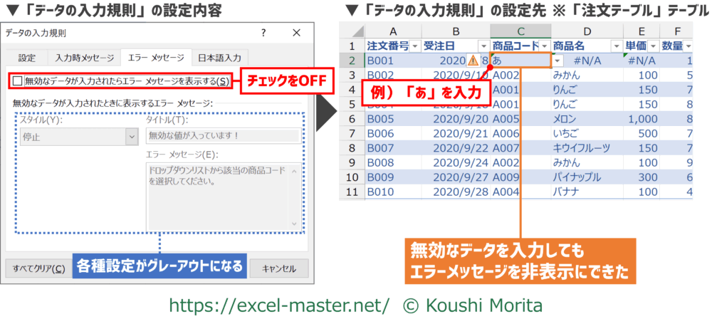 【参考】無効なデータ入力時のエラーメッセージ表示有無も設定可能