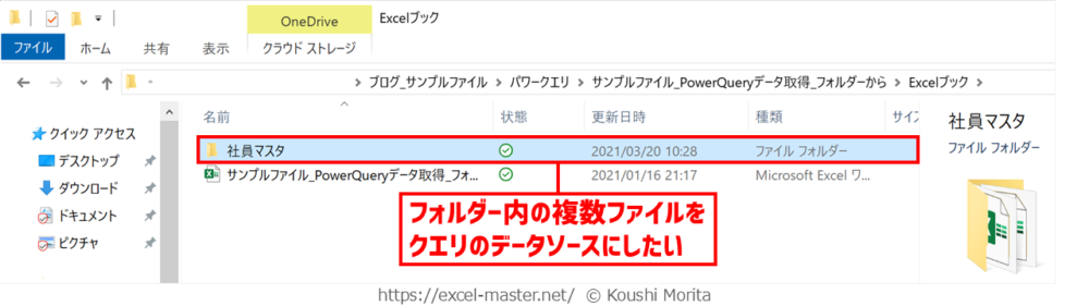 「フォルダーから」コマンドの場合、デフォルトのクエリ名はフォルダー名になる(「社員マスタ」フォルダーの場合は「社員マスタ」等)。
