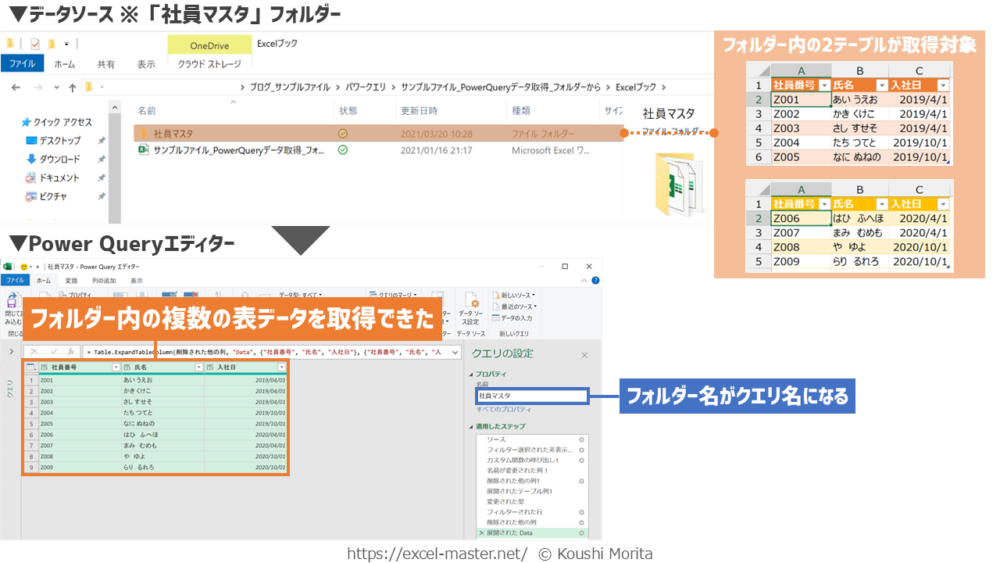 Power Queryエディター上でフォルダー内の複数の表データ(「社員マスタ」フォルダー内の「社員マスタ_2019」テーブルと「社員マスタ_2020」テーブル)を取得できました。