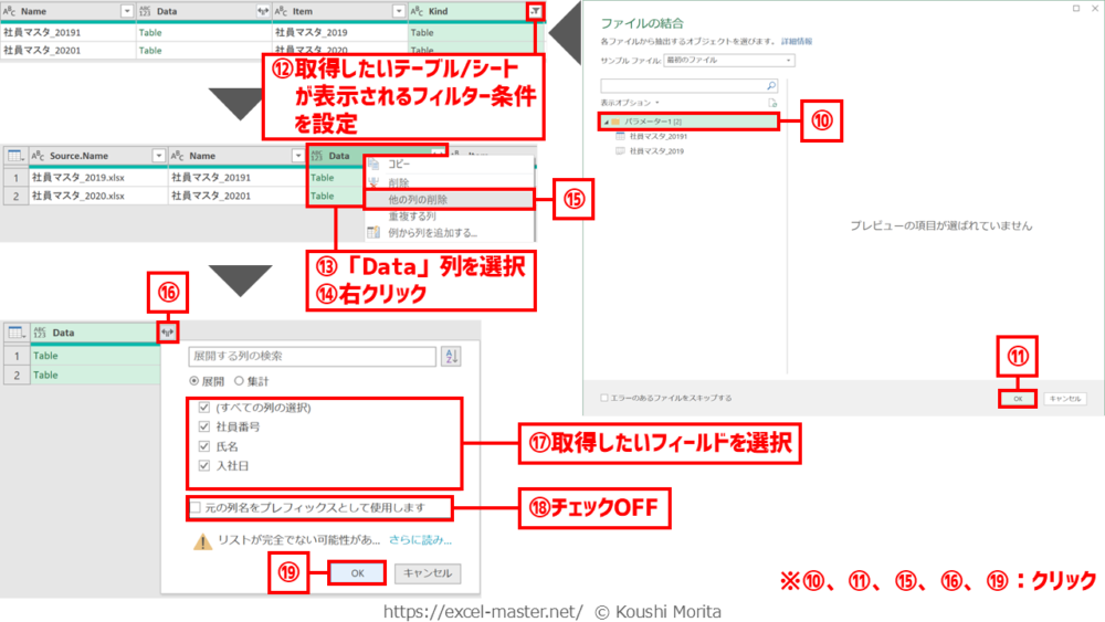 手順⑩⑪の「ファイルの結合」ダイアログの見方は、「Excelブックから」コマンドのナビゲーター画面とほぼ同じ(詳細は下記参考記事を参照)。