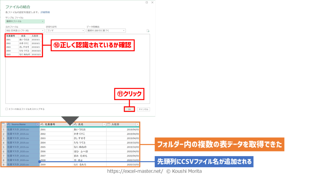 手順⑩⑪の「ファイルの結合」ダイアログの見方は、「テキストまたはCSVから」コマンドのプレビュー画面とほぼ同じ(詳細は下記参考記事を参照)。