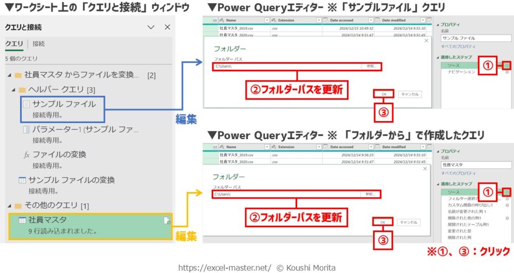 なお、「フォルダーから」コマンドの場合、「ヘルパークエリ」グループ内の「サンプルファイル」クエリの「ソース」ステップも併せて編集しないと変更が反映されないことがあるため、セットで編集してください。