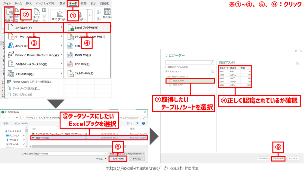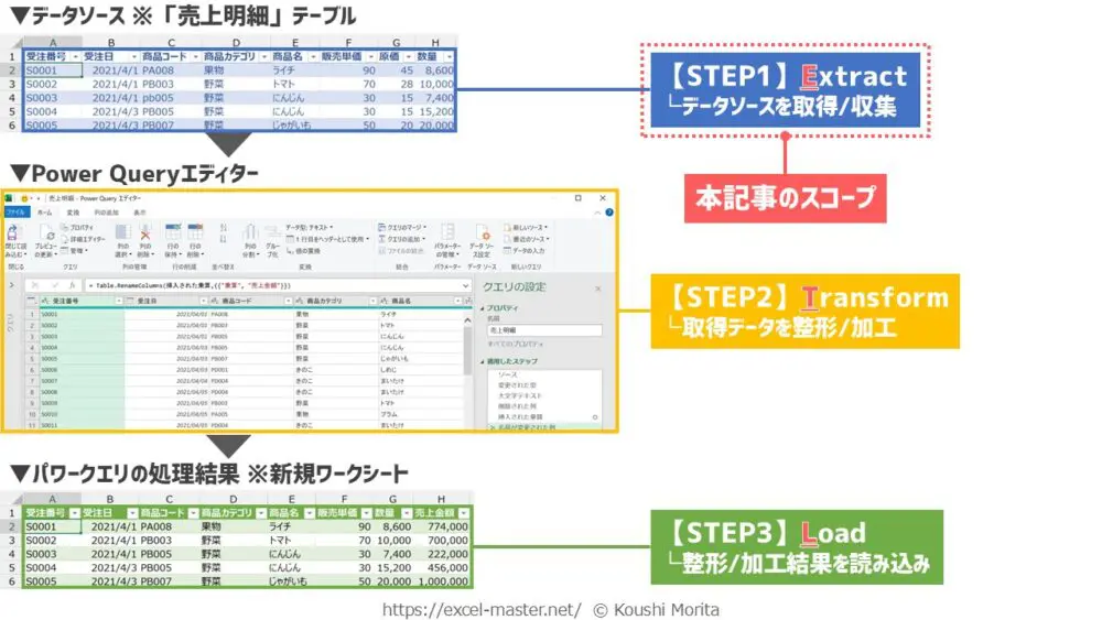 「Excelブックから」コマンドは、クエリの新規作成ステップのうち、STEP1の「データソースを取得/収集(Extract)」に該当する機能です。