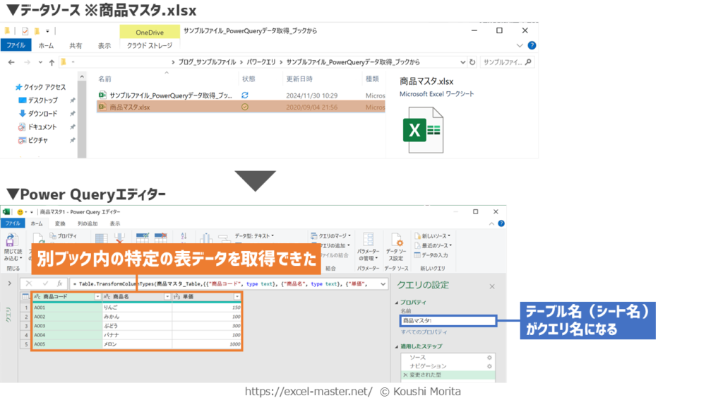 「Excelブックから」コマンドで単一の表データを取得した場合、デフォルトのクエリ名はテーブル名またはシート名になる(「商品マスタ」テーブルの場合は「商品マスタ」等)。