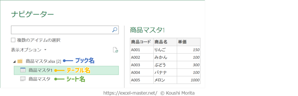 ちなみに、今回の「商品マスタ」のように、テーブル名とシート名が同じ場合、名前の重複を避けるために、ナビゲーター画面上ではテーブル名の方に数値が付加される仕様です。