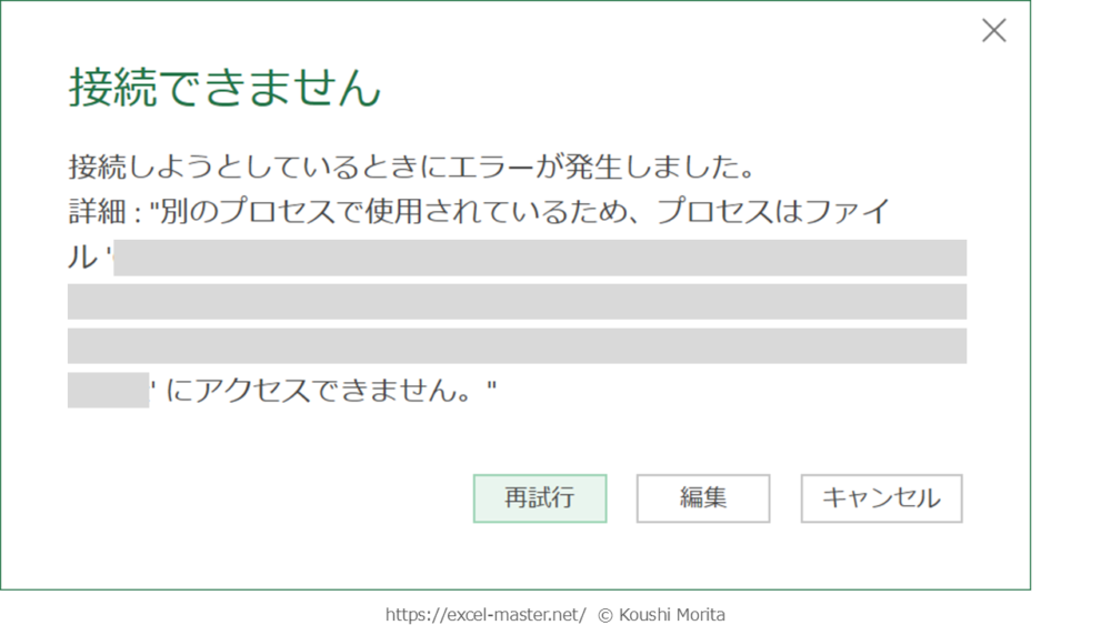 上記エラーメッセージの「キャンセル」ボタン押下→該当ブックを閉じる→再度データ取得手順をやり直し - 第三者が該当ブックを開いている場合(共有フォルダー配下等):
