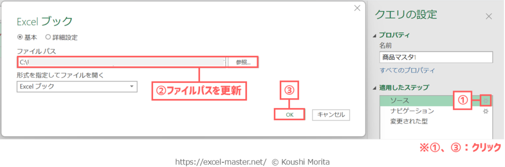 クエリ作成後、データソースに指定したExcelブックの変更手順