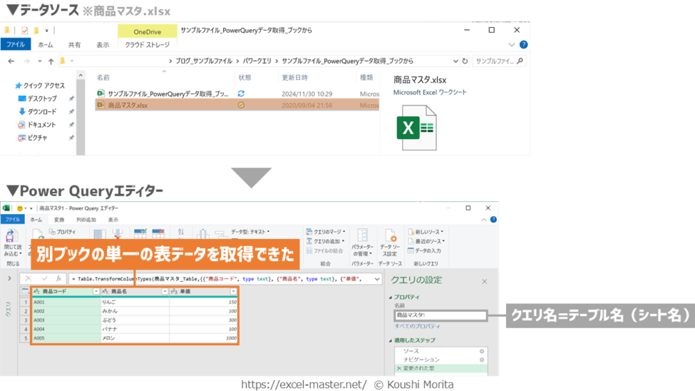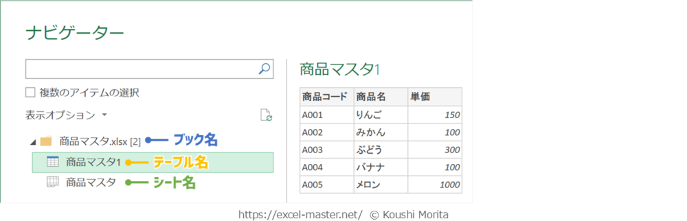 「Excelブックから」コマンドで単一の表データを取得した場合、デフォルトのクエリ名はテーブル名またはシート名になる(「商品マスタ1」テーブルの場合は「商品マスタ1」等)。