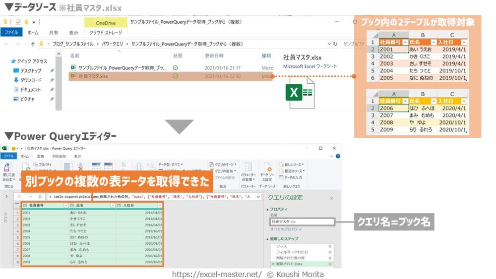 「Excelブックから」コマンドで複数の表データを取得した場合、デフォルトのクエリ名はブック名になる(「社員マスタ.xlsx」の場合は「社員マスタ.xlsx」等)。