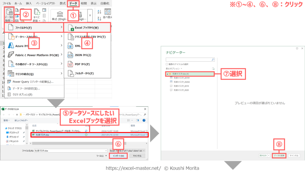「Excelブックから」コマンドは、クエリの新規作成ステップのうち、Step1の「データソースを取得/収集(Extract)」に該当する機能です。
