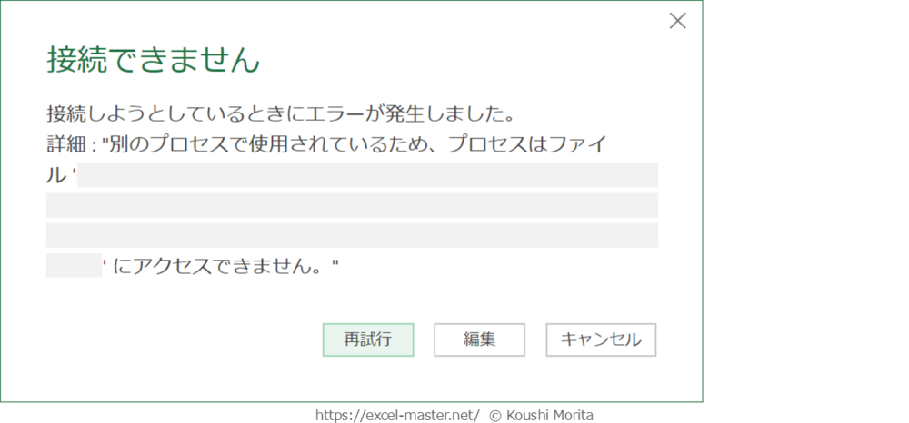 上記エラーメッセージの「キャンセル」ボタン押下→該当ブックを閉じる→再度データ取得手順をやり直し - 第三者が該当ブックを開いている場合(共有フォルダー配下等):