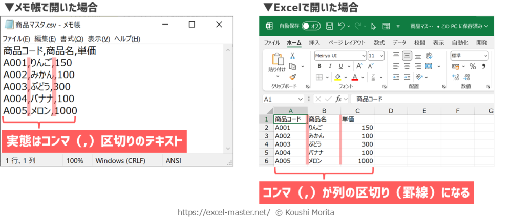 そもそもCSVは「Comma Separated Value」の略称で、実態はコンマ(,)区切りのテキストだからです。