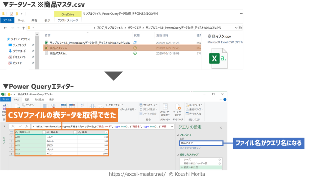 「テキストまたはCSVから」コマンドの場合、デフォルトのクエリ名はファイル名になる(「商品マスタ.csv」の場合は「商品マスタ」等)。