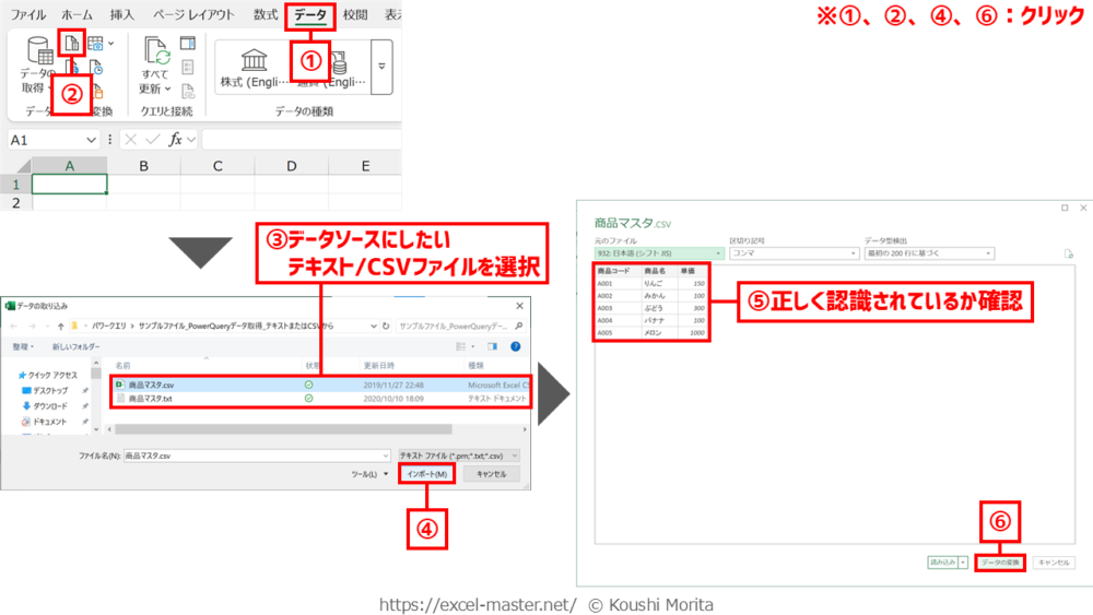 「商品マスタ.csv」を対象に「テキストまたはCSVから」コマンドを使用したイメージが以下です。