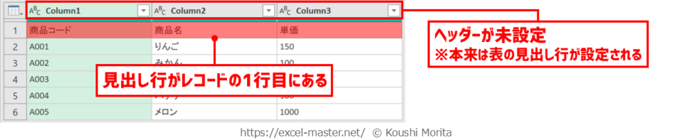 前述の手順⑥の結果、データソースに指定したファイルによっては、Power Queryエディター上のヘッダーが「Column1」等となり、見出し行がレコードの1行目になってしまうケースがあります。