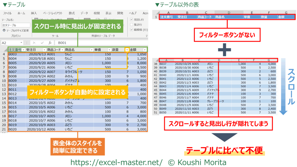 テーブルとまったく同じようにすることは難しいですが、Excelの基本機能を2つ活用することで使いやすい表にできますよ!