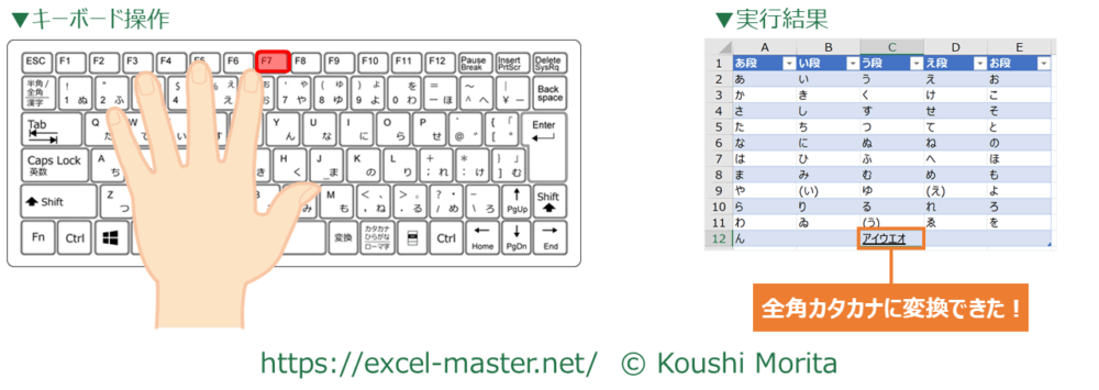 11.全角カタカナへ変換:「F7」