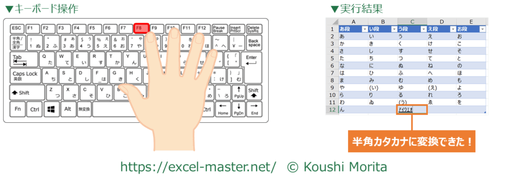12.半角カタカナへ変換:「F8」