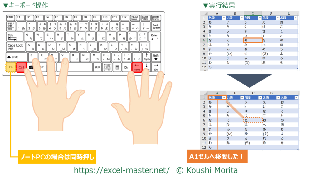 1.A1セルへ移動:「Ctrl」+「Home」