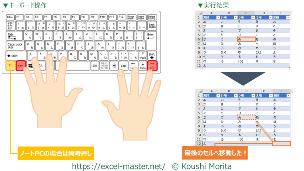 このショートカットキーを使うと、瞬時に最後のセルに移動します。