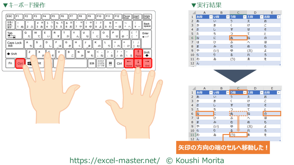 前述の3(「Ctrl」+矢印)と6(「Shift」+矢印)の応用技です。