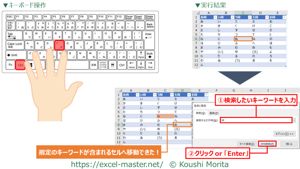 4.指定のキーワードを含むセルへ移動:「Ctrl」+「F」