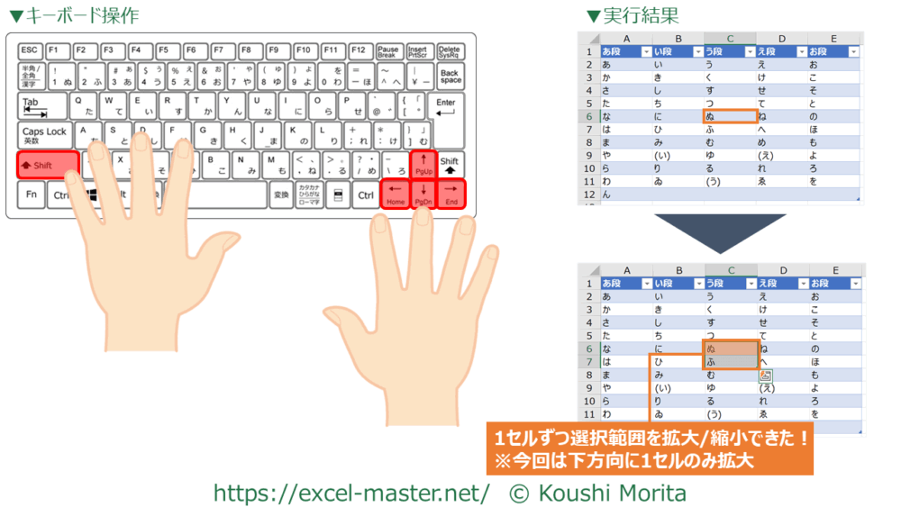 6.1セルずつ選択範囲を拡大/縮小:「Shift」+矢印