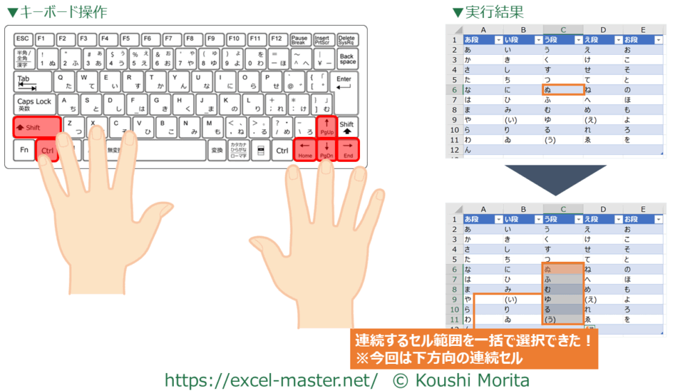 7.連続セルを一括選択:「Ctrl」+「Shift」+矢印