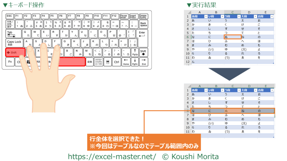 このショートカットキーで選択中のセルが含まれる行全体を選択できます。