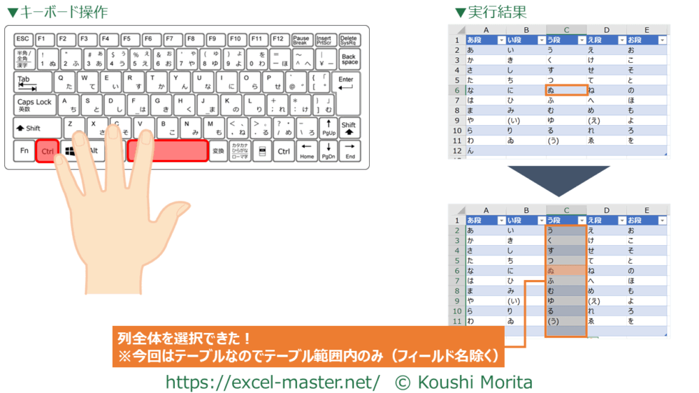 9.列全体を選択:「Ctrl」+「Space」