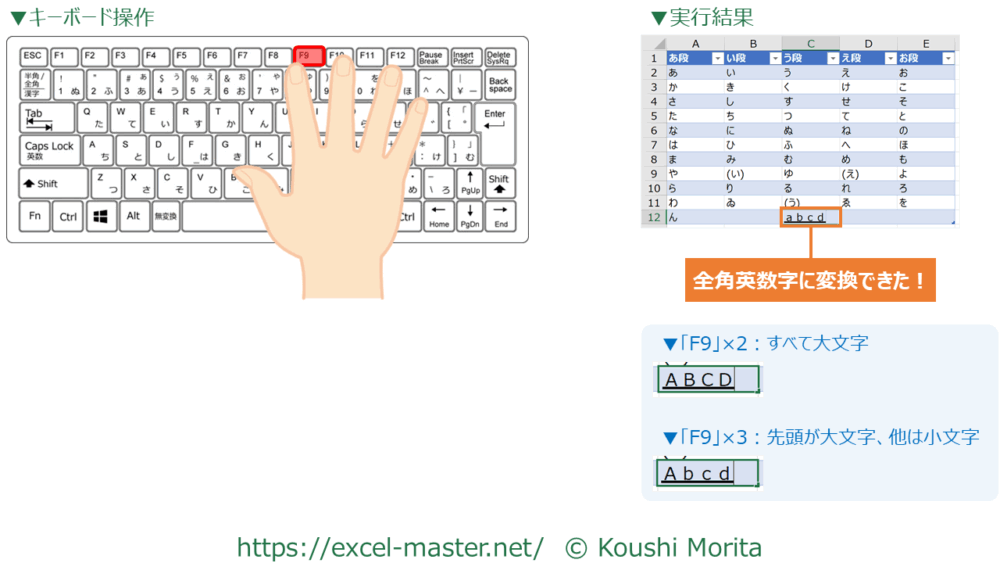 なお、英字については、「F9」を押した回数で以下のように変わります。