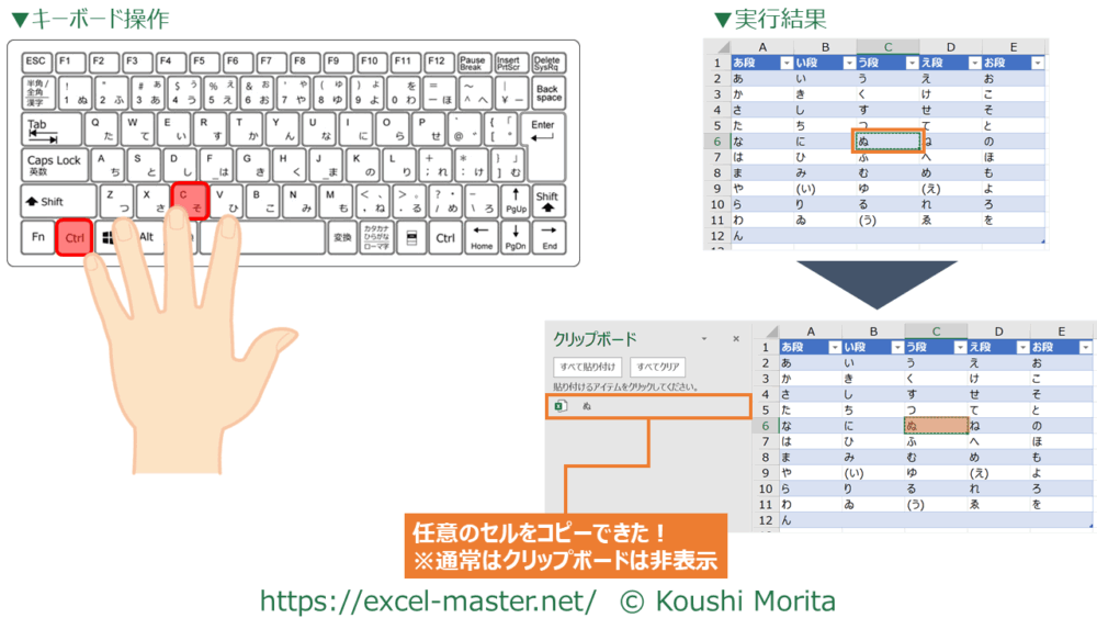 このショートカットキーを使うと、選択中のセル範囲をコピーできます。
