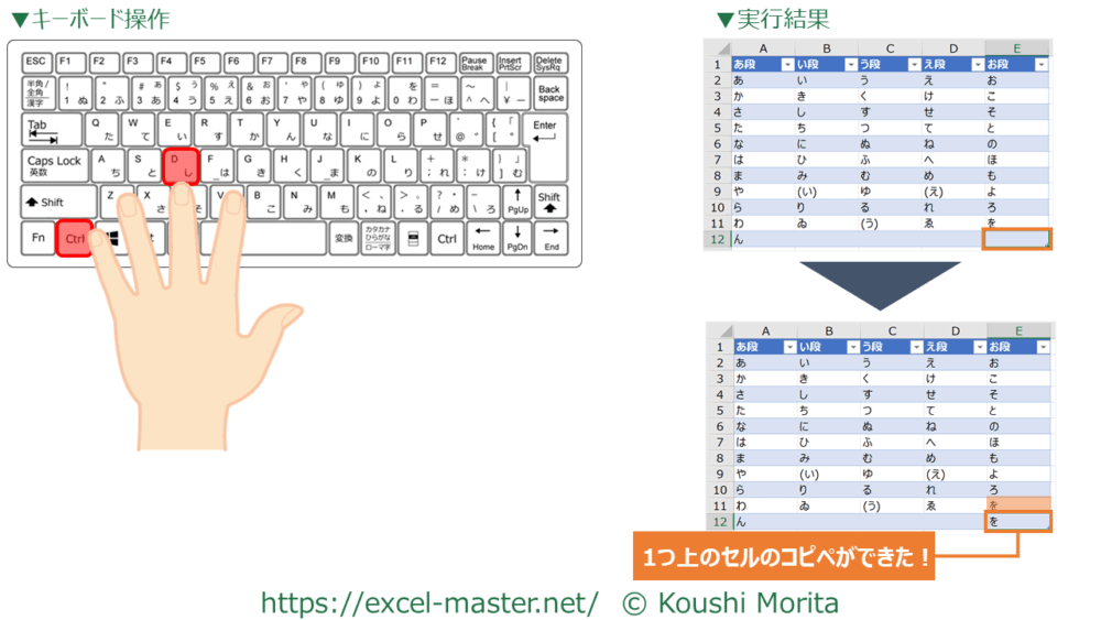 「1つ上のセル」という制約はあるものの、通常のコピペ(「Ctrl」+「C」→「Ctrl」+「V」)をワンアクションで行えるため、1つ上のセルをコピペを行う場合は積極的に活用すると良いでしょう。