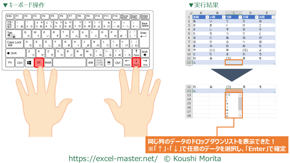 このショートカットキーを使うと、同じ列で入力済みのデータがドロップダウンリスト形式で入力できます。