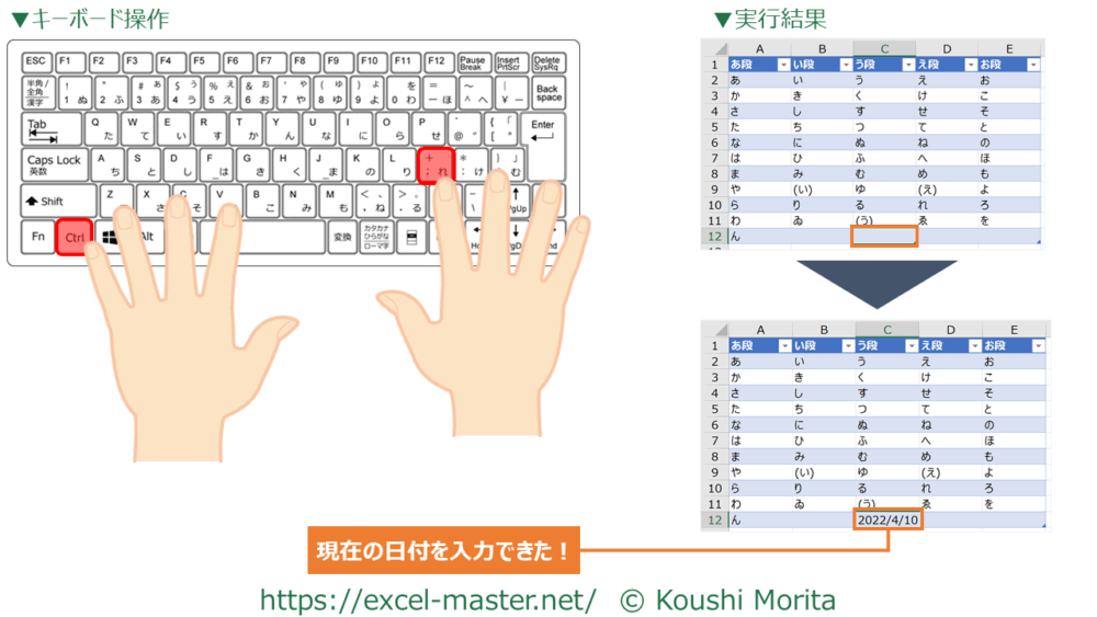このショートカットキーを使うと、選択中のセル範囲へ現在の日付を入力できます。