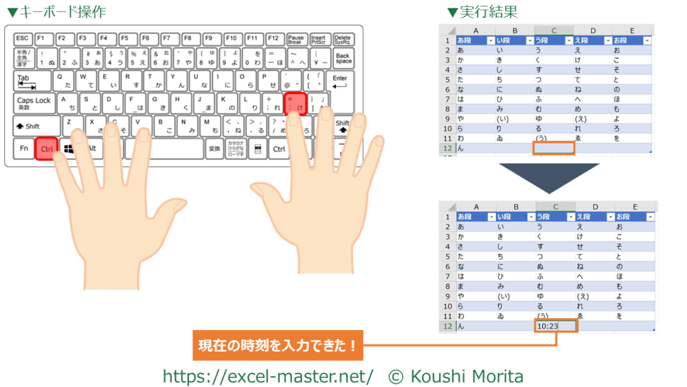 このショートカットキーを使うと、選択中のセル範囲へ現在の時刻を入力できます。