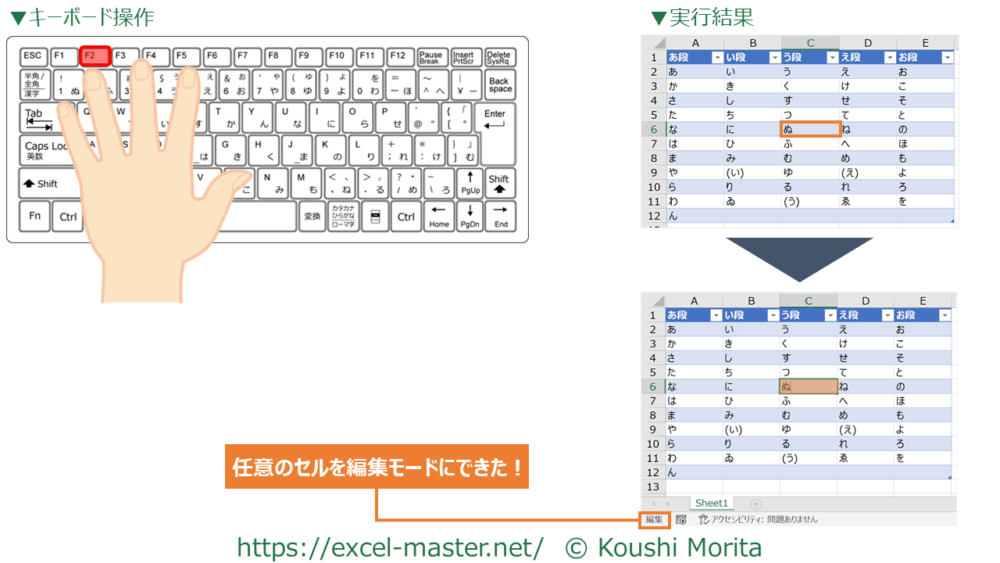 このショートカットキーを使うと、選択中のセルを編集モードに変更できます。