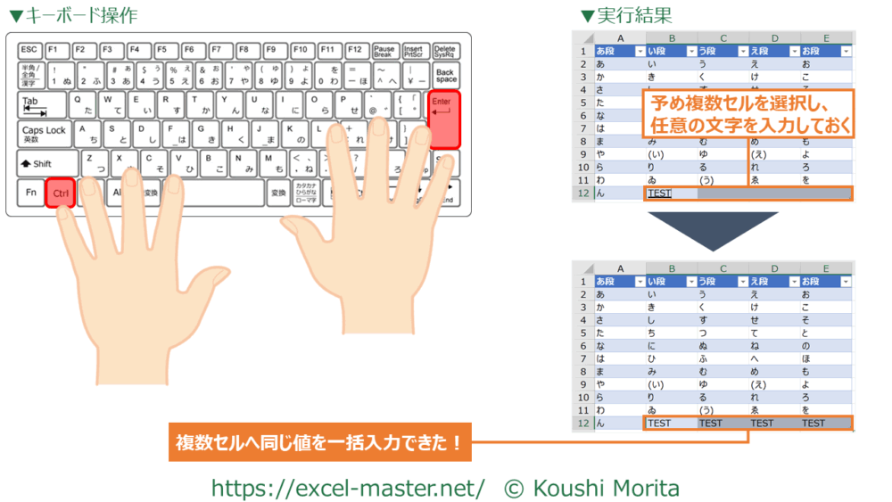 25.選択範囲へ一括入力:「Ctrl」+「Enter」