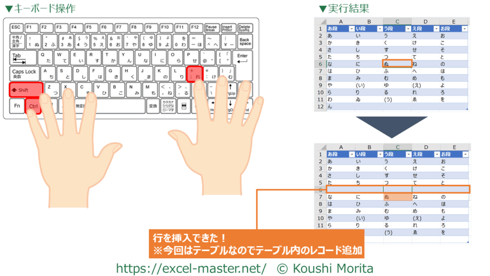 なお、テーブル内でこのショートカットキーを実行すると、テーブル範囲に限って行(レコード)が挿入されます。