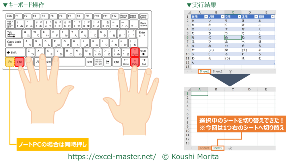 このショートカットキーを使うと、同じブックの別シートに切り替えることができます。