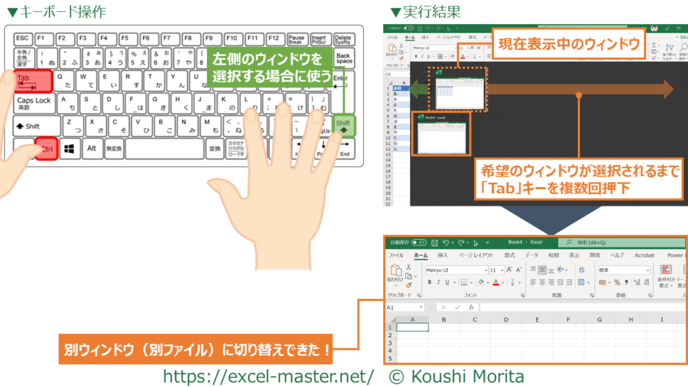 「Alt」+「Tab」で1つ右のウィンドウ、「Alt」+「Shift」+「Tab」で1つ左のウィンドウへ移動し、「Alt」キーを離すことで選択したウィンドウへ切り替わります。