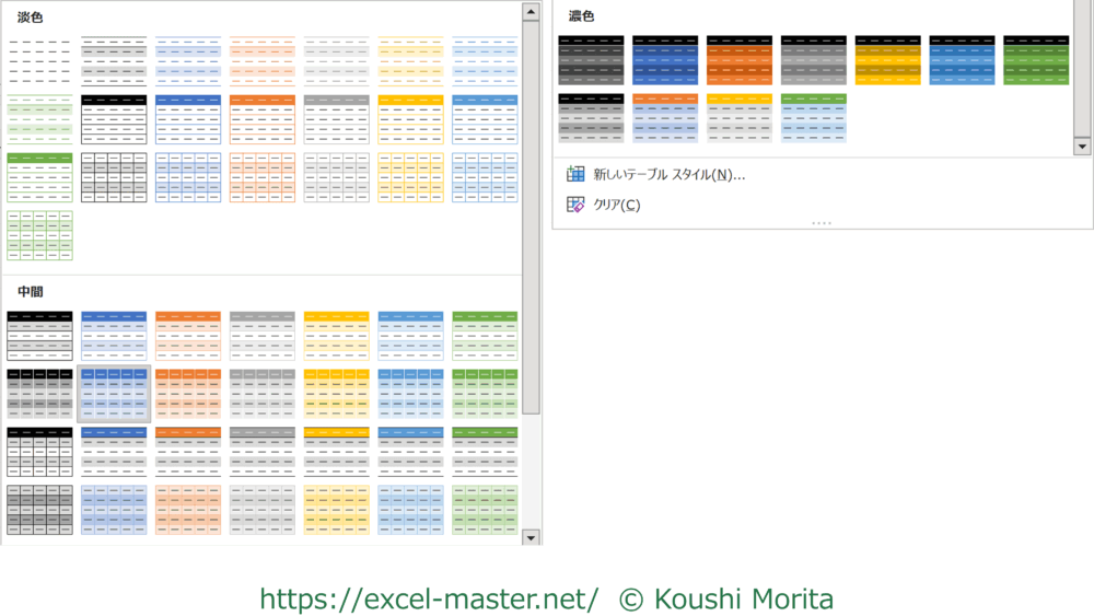 手順④で選択できるテーブルスタイルは以下の通りです。