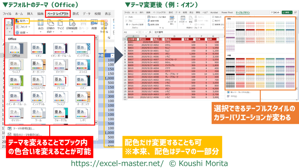 手順④で表示されるテーブルスタイルは、実はExcelブックのテーマと連動しています。