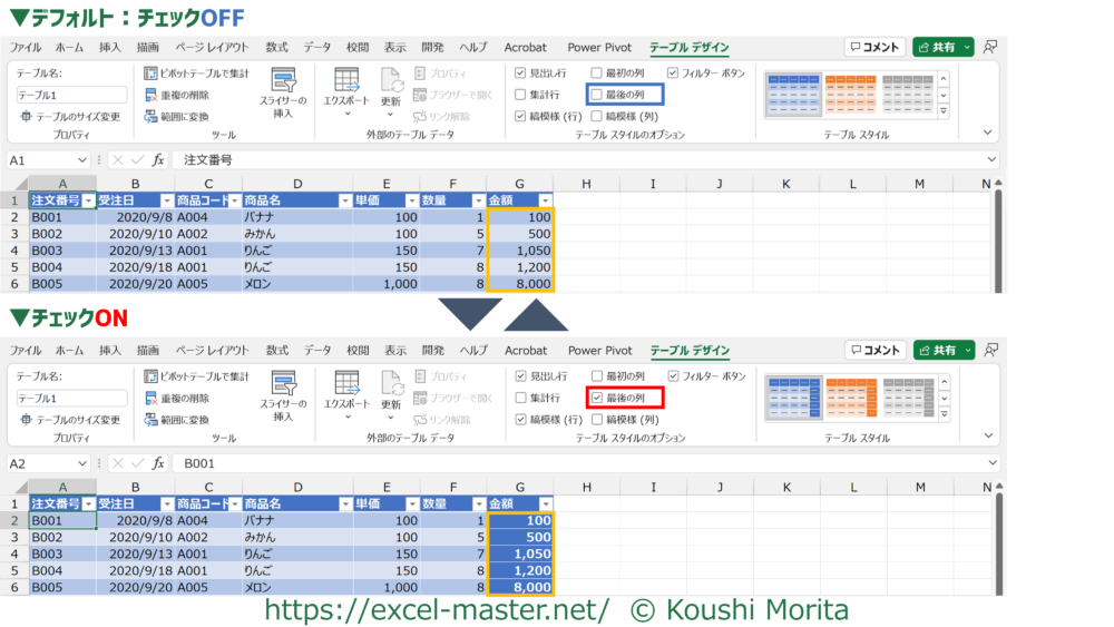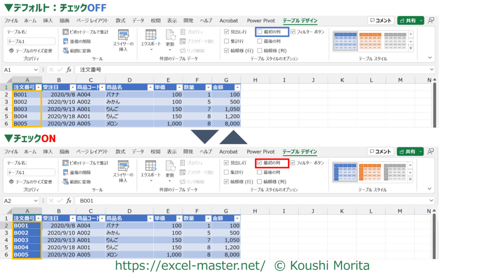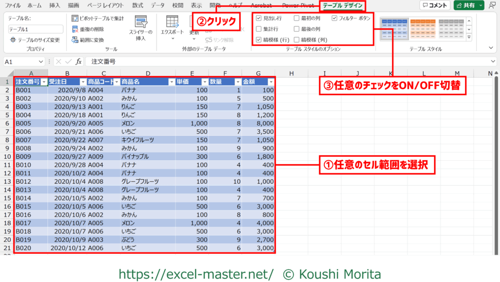 テーブルスタイルは「テーブルスタイルのオプション」を設定することで、部分的に見た目を変更することが可能です。